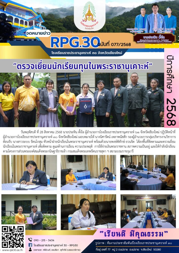 >>>>วันพฤหัสบดี ที่ 28 สิงหาคม 2568 นายประทิน ตั้งใจ ผู้อำนวยการโรงเรียนราชประชานุเคราะห์ ๖๑ จังหวัดเชียงใหม่ ปฏิบัติหน้าที่ ผู้อำนวยการโรงเรียนราชประชานุเคราะห์ ๓๐ จังหวัดเชียงใหม่ มอบหมายให้ นางนิศารัตน์ เหลาพนัสสัก รองผู้อำนวยการกลุ่มบริหารงานวิชาการต้อนรับ นางสาวระบบ รัตนโกสุม หัวหน้าฝ่ายนักเรียนในพระราชานุเคราะห์ พร้อมด้วยนายพงษ์พิทักษ์ ยวนจิต ได้ลงพื้นที่ติดตามและตรวจเยี่ยมนักเรียนในพระราชานุเคาะห์ เพื่อติดตาม ดูแลด้านการเรียน ความประพฤติ การใช้จ่ายเงินพระราชทาน สภาพความเป็นอยู่ และให้กำลังนักเรียนตามโครงการส่วนพระองค์สมเด็จพระกนิษฐาธิราชเจ้า กรมสมเด็จพระเทพรัตนราชสุดา ฯ สยามบรมราชกุมารี