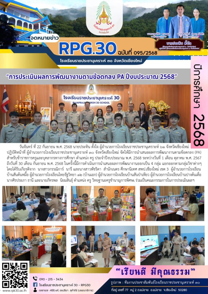 >>>> วันจันทร์ ที่ 22 กันยายน พ.ศ. 2568 นายประทิน ตั้งใจ ผู้อำนวยการโรงเรียนราชประชานุเคราะห์ ๖๑ จังหวัดเชียงใหม่ ปฏิบัติหน้าที่ ผู้อำนวยการโรงเรียนราชประชานุเคราะห์ ๓๐ จังหวัดเชียงใหม่ จัดให้มีการนำเสนอผลการพัฒนางานตามข้อตกลง (PA)สำหรับข้าราชการครูและบุคลากรทางการศึกษา ตำแหน่ง ครู ประจำปีงบประมาณ พ.ศ. 2568 ระหว่างวันที่ 1 เดือน ตุลาคม พ.ศ. 2567 ถึงวันที่ 30 เดือน กันยายน พ.ศ. 2568 ในครั้งนี้มีการดำเนินการนำเสนอผลการพัฒนางานออกเป็น 4 กลุ่ม แยกออกตามกลุ่มวิชาต่างๆโดยได้รับเกียรติจาก นางสาวกรรณิการ์ นารี และนางสาวพัชริดา สำนักเนตร ศึกษานิเทศ สพป.เชียงใหม่ เขต 3 ผู้อำนวยการโรงเรียนบ้านสันต้นหมื้อ ผู้อำนวยการโรงเรียนไทยรัฐวิทยา ๑๒ (บ้านเอก) ผู้อำนวยการโรงเรียนบ้านสันป่าเหียว ผู้อำนวยการโรงเรียนบ้านปางต้นเดื่อนางศิรประภา ธานี และนายภัทรพล นิยมสินธุ์ ตำแหน่ง ครู วิทยฐานะครูชำนาญการพิเศษ ร่วมเป็นคณะกรรมการในการประเมินผลฯ