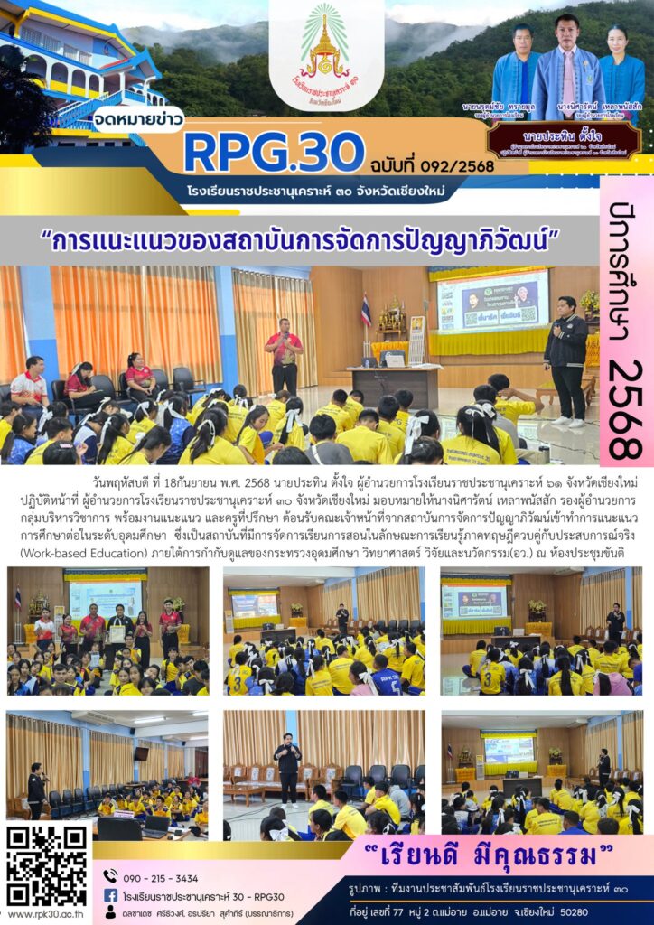 >>>>วันพฤหัสบดี ที่ 18 กันยายน พ.ศ. 2568 นายประทิน ตั้งใจ ผู้อำนวยการโรงเรียนราชประชานุเคราะห์ ๖๑ จังหวัดเชียงใหม่ปฏิบัติหน้าที่ ผู้อำนวยการโรงเรียนราชประชานุเคราะห์ ๓๐ จังหวัดเชียงใหม่ มอบหมายให้นางนิศารัตน์ เหลาพนัสสัก รองผู้อำนวยการกลุ่มบริหารวิชาการ พร้อมงานแนะแนว และครูที่ปรึกษา ต้อนรับคณะเจ้าหน้าที่จากสถาบันการจัดการปัญญาภิวัฒน์เข้าทำการแนะแนวการศึกษาต่อในระดับอุดมศึกษา ซึ่งเป็นสถาบันที่มีการจัดการเรียนการสอนในลักษณะการเรียนรู้ภาคทฤษฎีควบคู่กับประสบการณ์จริง(Work-based Education) ภายใต้การกำกับดูแลของกระทรวงอุดมศึกษา วิทยาศาสตร์ วิจัยและนวัตกรรม(อว.) ณ ห้องประชุมขันติ