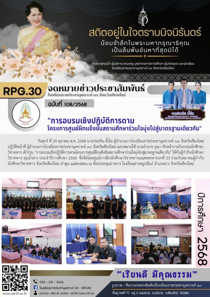 >>>วันศุกร์ ที่ 24 ตุลาคม พ.ศ. 2568 นายประทิน ตั้งใจ ผู้อำนวยการโรงเรียนราชประชานุเคราะห์ ๖๑ จังหวัดเชียงใหม่ ปฏิบัติหน้าที่ ผู้อำนวยการโรงเรียนราชประชานุเคราะห์ ๓๐ จังหวัดเชียงใหม่ มอบหมายให้ นายอำนาจ กูณา หัวหน้างานกิจกรรมนักศึกษาวิชาทหาร เข้าร่วม “การอบรมเชิงปฏิบัติการตามโครงการศูนย์ฝึกแข็งขันสถานศึกษาร่วมใจมุ่งไปสู่มาตรฐานเดียวกัน” ให้กับผู้กำกับนักศึกษาวิชาทหาร ลุ่มน้ำฝาง ประจำปีการศึกษา 2568 ซึ่งจัดโดยศูนย์การฝึกนักศึกษาวิชาทหารมณฑลทหารบกที่ 33 ร่วมกับสมาคมผู้กำกับนักศึกษาวิชาทหาร จังหวัดเชียงใหม่ ลำพูน แม่ฮ่องสอน ณ ห้องประชุมอ่างขาง โรงเรียนฝางชนูปถัมภ์ อำเภอฝาง จังหวัดเชียงใหม่