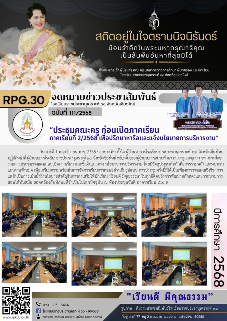 >>> วันเสาร์ที่ 1 พฤศจิกายน พ.ศ. 2568 นายประทิน ตั้งใจ ผู้อำนวยการโรงเรียนราชประชานุเคราะห์ ๖๑ จังหวัดเชียงใหม่ ปฏิบัติหน้าที่ ผู้อำนวยการโรงเรียนราชประชานุเคราะห์ ๓๐ จังหวัดเชียงใหม่ พร้อมด้วยรองผู้อำนวยการสถานศึกษา คณะครูและบุคลากรทางการศึกษาร่วมการประชุมวางแผนก่อนเปิดภาคเรียน และชี้แจ้งแนวทาง นโยบายการบริหารงาน โดยมีวัตถุประสงค์หลักคือการรวมพลังและทบทวนแผนงานทั้งหมด เพื่อเตรียมความพร้อมในการจัดการเรียนการสอนอย่างเต็มรูปแบบ การประชุมครั้งนี้มิได้เป็นเพียงการวางแผนเชิงวิชาการแต่ยังเป็นการเน้นย้ำถึงนโยบายสำคัญในการส่งเสริมให้นักเรียน “เรียนดี มีคุณธรรม” ในทุกมิติจนถึงการพัฒนาหลักสูตรและกระบวนการสอนให้ทันสมัย สอดคล้องกับทักษะที่จำเป็นในโลกปัจจุบัน ณ ห้องประชุมขันติ อาคารเรียน 216 ล