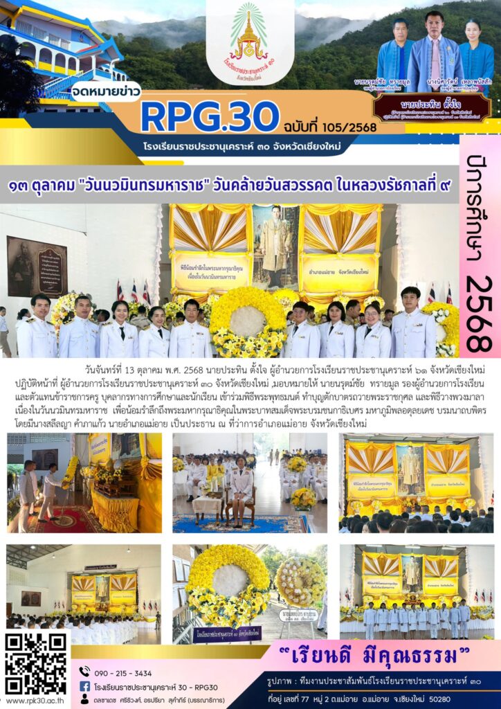 >>>วันจันทร์ที่ 13 ตุลาคม พ.ศ. 2568 นายประทิน ตั้งใจ ผู้อำนวยการโรงเรียนราชประชานุเคราะห์ ๖๑ จังหวัดเชียงใหม่ ปฏิบัติหน้าที่ ผู้อำนวยการโรงเรียนราชประชานุเคราะห์ ๓๐ จังหวัดเชียงใหม่ มอบหมายให้ นายนรุตม์ชัย ทรายมูล รองผู้อำนวยการโรงเรียนและตัวแทนข้าราชการครู บุคลากรทางการศึกษาและนักเรียน เข้าร่วมพิธีพระพุทธมนต์ ทำบุญตักบาตรถวายพระราชกุศล เเละพิธีวางพวงมาลา เนื่องในวันนวมินทรมหาราช เพื่อน้อมรำลึกถึงพระมหากรุณาธิคุณในพระบาทสมเด็จพระบรมชนกาธิเบศร มหาภูมิพลอดุลยเดช บรมนาถบพิตร โดยมีนางสลีลญา คำภาแก้ว นายอำเภอแม่อาย เป็นประธาน ณ ที่ว่าการอำเภอแม่อาย จังหวัดเชียงใหม่