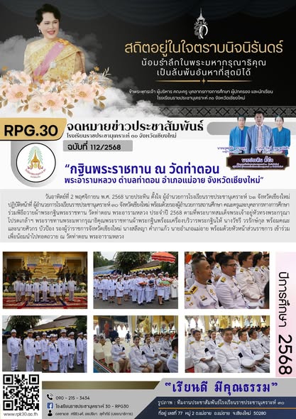 >>> วันอาทิตย์ที่ 2 พฤศจิกายน พ.ศ. 2568 นายประทิน ตั้งใจ ผู้อำนวยการโรงเรียนราชประชานุเคราะห์ ๖๑ จังหวัดเชียงใหม่ ปฏิบัติหน้าที่ ผู้อำนวยการโรงเรียนราชประชานุเคราะห์ ๓๐ จังหวัดเชียงใหม่ พร้อมด้วยรองผู้อำนวยการสถานศึกษา คณะครูและบุคลากรทางการศึกษาร่วมพิธีถวายผ้าพระกฐินพระราชทาน วัดท่าตอน พระอารามหลวง ประจำปี 2568 ตามที่พระบาทสมเด็จพระเจ้าอยู่หัวทรงพระกรุณาโปรดเกล้าฯ พระราชทานพระมหากรุณาธิคุณพระราชทานผ้าพระกฐินพร้อมเครื่องบริวารพระกฐินให้ นางวัชรี วรรักษ์กุล พร้อมคณะ และนายศิวกร บัวป้อง รองผู้ว่าราชการจังหวัดเชียงใหม่ นางสลีลญา คำภาแก้ว นายอำเภอแม่อาย พร้อมด้วยหัวหน้าส่วนราชการ เข้าร่วม เพื่อน้อมนำไปทอดถวาย ณ วัดท่าตอน พระอารามหลวง