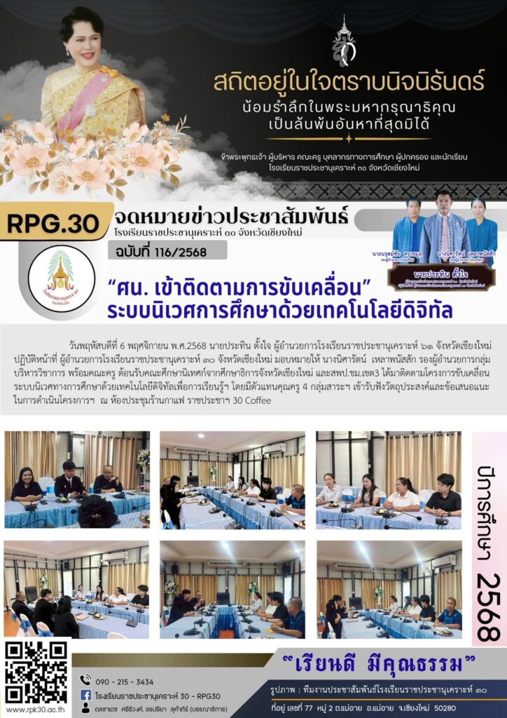 >>> วันพฤหัสบดีที่ 6 พฤศจิกายน พ.ศ.2568 นายประทิน ตั้งใจ ผู้อำนวยการโรงเรียนราชประชานุเคราะห์ ๖๑ จังหวัดเชียงใหม่ ปฏิบัติหน้าที่ ผู้อำนวยการโรงเรียนราชประชานุเคราะห์ ๓๐ จังหวัดเชียงใหม่ มอบหมายให้ นางนิศารัตน์ เหลาพนัสสัก รองผู้อำนวยการกลุ่มบริหารวิชาการ พร้อมคณะครู ต้อนรับคณะศึกษานิเทศก์จากศึกษาธิการจังหวัดเชียงใหม่ และสพป.ชม.เขต3 ได้มาติดตามโครงการขับเคลื่อนระบบนิเวศทางการศึกษาด้วยเทคโนโลยีดิจิทัลเพื่อการเรียนรู้ฯ โดยมีตัวแทนคุณครู 4 กลุ่มสาระฯ เข้ารับฟังวัตถุประสงค์และข้อเสนอแนะในการดำเนินโครงการฯ ณ ห้องประชุมร้านกาแฟ ราชประชาฯ 30 Coffee
