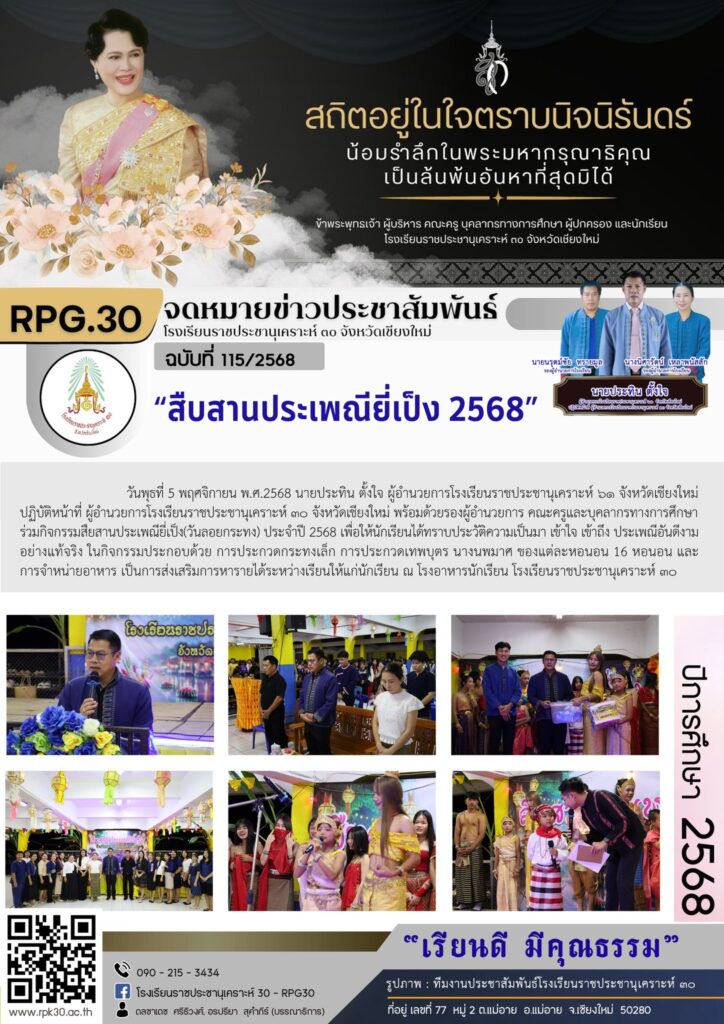 >>> วันพุธที่ 5 พฤศจิกายน พ.ศ.2568 นายประทิน ตั้งใจ ผู้อำนวยการโรงเรียนราชประชานุเคราะห์ ๖๑ จังหวัดเชียงใหม่ ปฏิบัติหน้าที่ ผู้อำนวยการโรงเรียนราชประชานุเคราะห์ ๓๐ จังหวัดเชียงใหม่ พร้อมด้วยรองผู้อำนวยการ คณะครูและบุคลากรทางการศึกษาร่วมกิจกรรมสืยสานประเพณียี่เป็ง(วันลอยกระทง) ประจำปี 2568 เพื่อให้นักเรียนได้ทราบประวัติความเป็นมา เข้าใจ เข้าถึง ประเพณีอันดีงามอย่างแท้จริง ในกิจกรรมประกอบด้วย การประกวดกระทงเล็ก การประกวดเทพบุตร นางนพมาศ ของแต่ละหอนอน 16 หอนอน และการจำหน่ายอาหาร เป็นการส่งเสริมการหารายได้ระหว่างเรียนให้แก่นักเรียน ณ โรงอาหารนักเรียน โรงเรียนราชประชานุเคราะห์ ๓๐