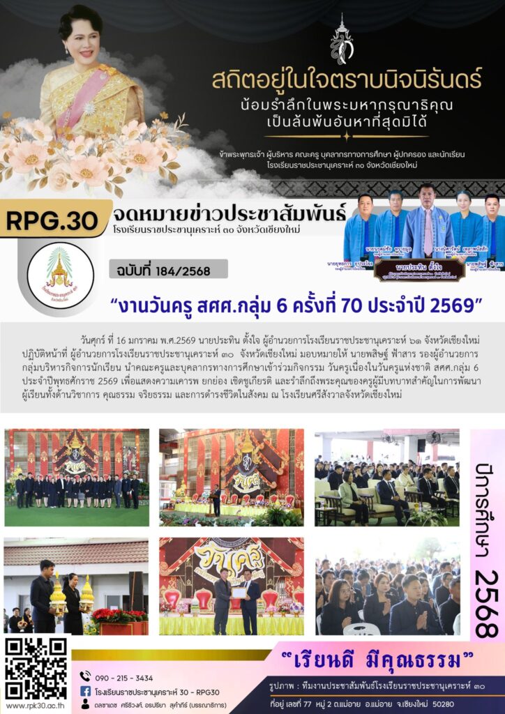 >>>วันศุกร์ ที่ 16 มกราคม พ.ศ.2569 นายประทิน ตั้งใจ ผู้อำนวยการโรงเรียนราชประชานุเคราะห์ ๖๑ จังหวัดเชียงใหม่ ปฏิบัติหน้าที่ ผู้อำนวยการโรงเรียนราชประชานุเคราะห์ ๓๐ จังหวัดเชียงใหม่ มอบหมายให้ นายพสิษฐ์ ฟ้าสาร รองผู้อำนวยการกลุ่มบริหารกิจการนักเรียน นำคณะครูและบุคลากรทางการศึกษาเข้าร่วมกิจกรรม วันครูเนื่องในวันครูแห่งชาติ สศศ.กลุ่ม 6 ประจำปีพุทธศักราช 2569 เพื่อแสดงความเคารพ ยกย่อง เชิดชูเกียรติ และรำลึกถึงพระคุณของครูผู้มีบทบาทสำคัญในการพัฒนาผู้เรียนทั้งด้านวิชาการ คุณธรรม จริยธรรม และการดำรงชีวิตในสังคม ณ โรงเรียนศรีสังวาลจังหวัดเชียงใหม่
