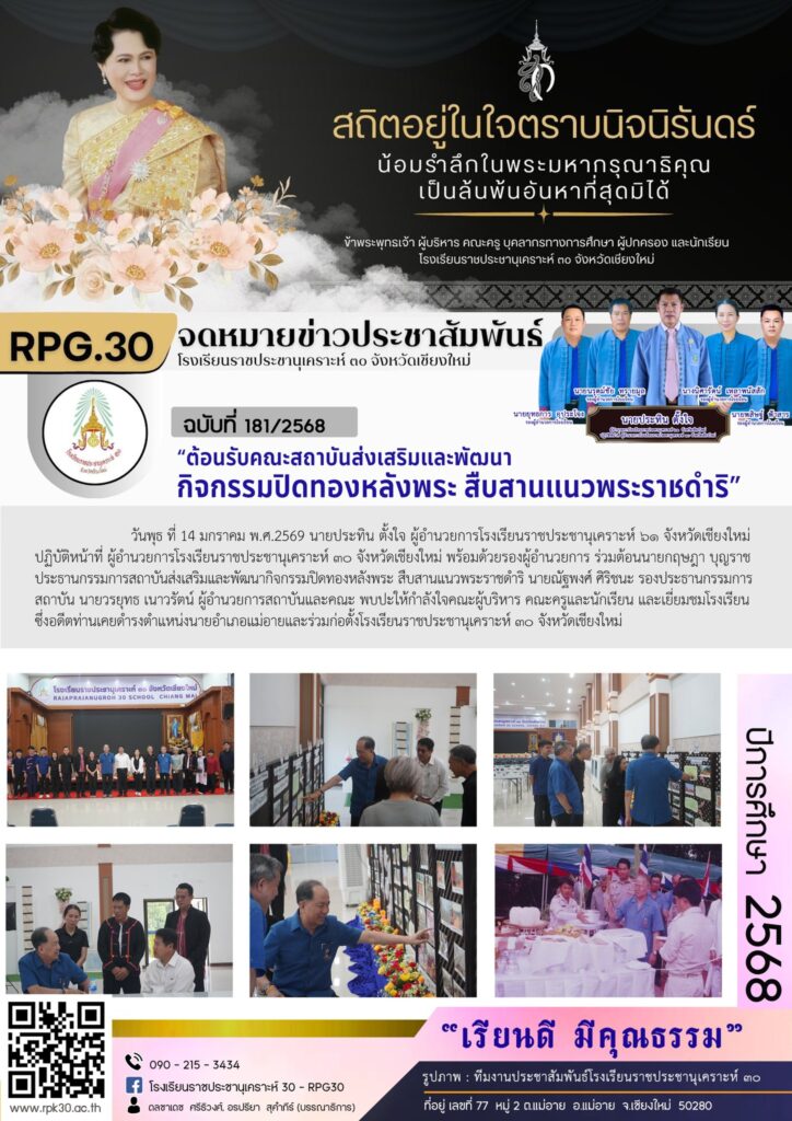 >>> วันพุธ ที่ 14 มกราคม พ.ศ.2569 นายประทิน ตั้งใจ ผู้อำนวยการโรงเรียนราชประชานุเคราะห์ ๖๑ จังหวัดเชียงใหม่ ปฏิบัติหน้าที่ ผู้อำนวยการโรงเรียนราชประชานุเคราะห์ ๓๐ จังหวัดเชียงใหม่ พร้อมด้วยรองผู้อำนวยการ ร่วมต้อนนายกฤษฎา บุญราช ประธานกรรมการสถาบันส่งเสริมและพัฒนากิจกรรมปิดทองหลังพระ สืบสานแนวพระราชดำริ นายณัฐพงศ์ ศิริชนะ รองประธานกรรมการสถาบัน นายวรยุทธ เนาวรัตน์ ผู้อำนวยการสถาบันและคณะ พบปะให้กำลังใจคณะผู้บริหาร คณะครูและนักเรียน และเยี่ยมชมโรงเรียน ซึ่งอดีตท่านเคยดำรงตำแหน่งนายอำเภอแม่อายและร่วมก่อตั้งโรงเรียนราชประชานุเคราะห์ ๓๐ จังหวัดเชียงใหม่
