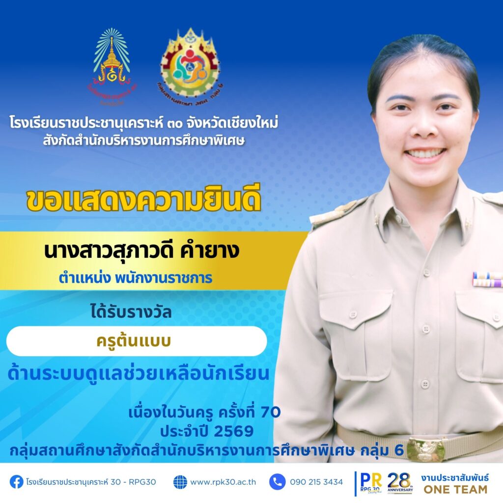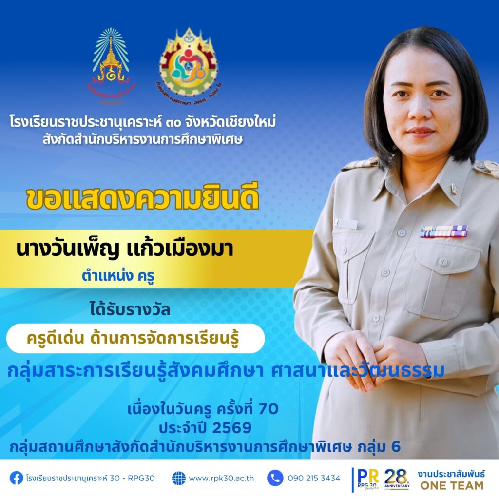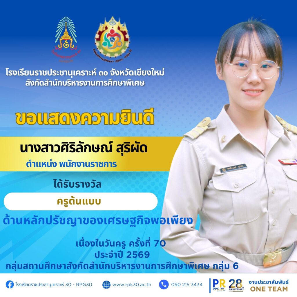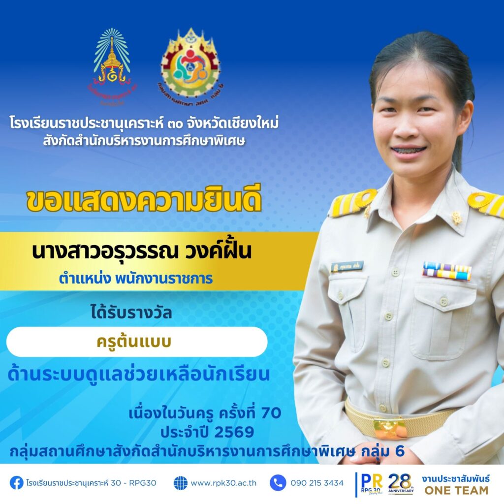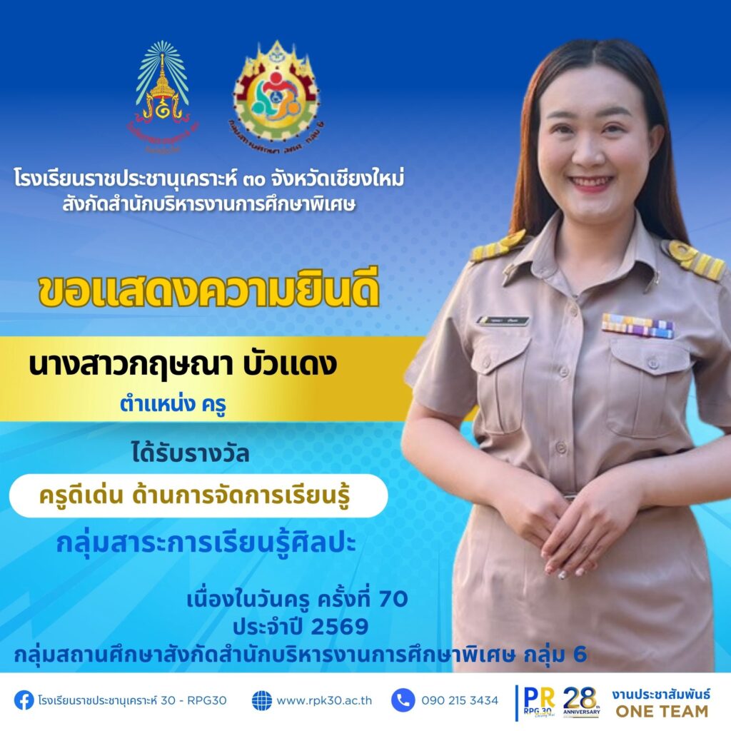 ข้าราชการครูและบุคลากรทางการศึกษา ที่ได้รับรางวัล ครูผู้สอนดีเด่น และรางวัลครูต้นแบบ เนื่องในวันครู ครั้งที่ 70 ประจำปี 2569 จากสำนักบริหารงานการศึกษาพิเศษ กลุ่ม 6 จำนวน 24 ราย ดังนี้