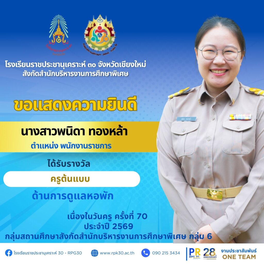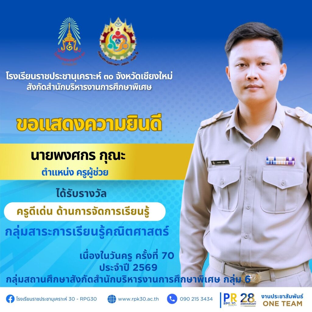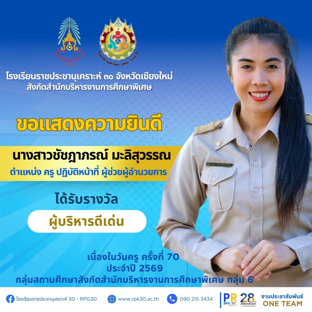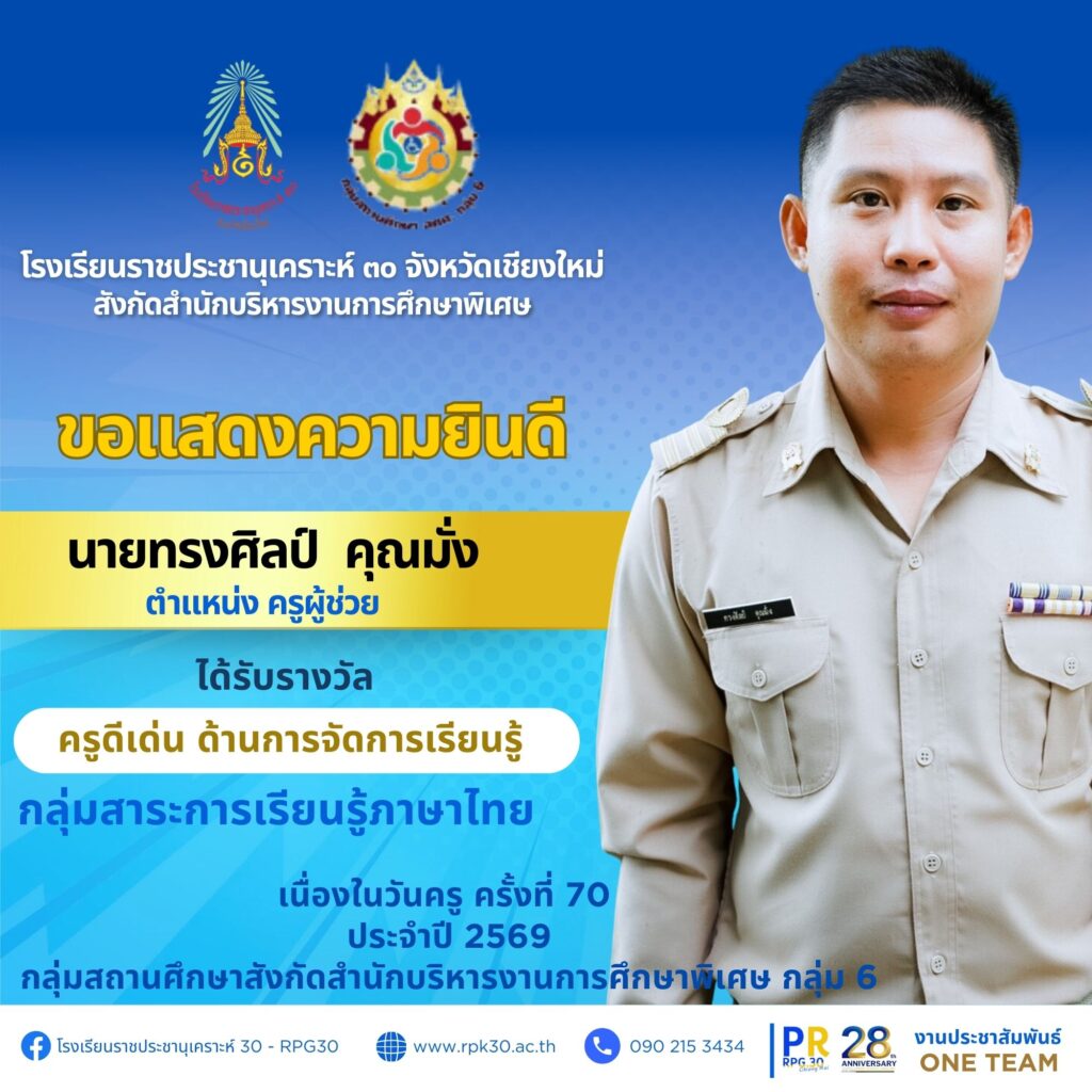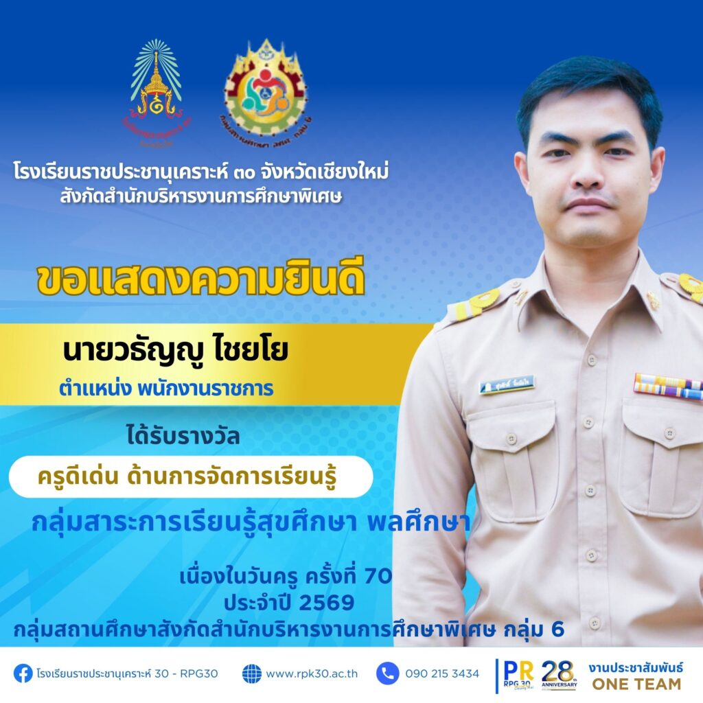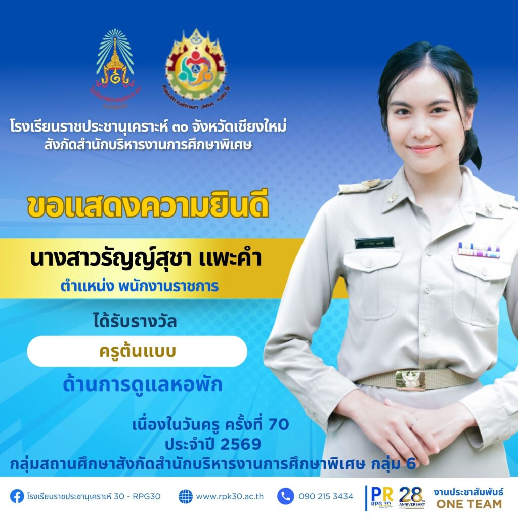 ข้าราชการครูและบุคลากรทางการศึกษา ที่ได้รับรางวัล ครูผู้สอนดีเด่น และรางวัลครูต้นแบบ เนื่องในวันครู ครั้งที่ 70 ประจำปี 2569 จากสำนักบริหารงานการศึกษาพิเศษ กลุ่ม 6 จำนวน 24 ราย ดังนี้