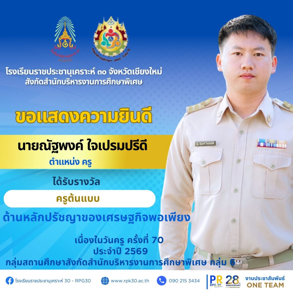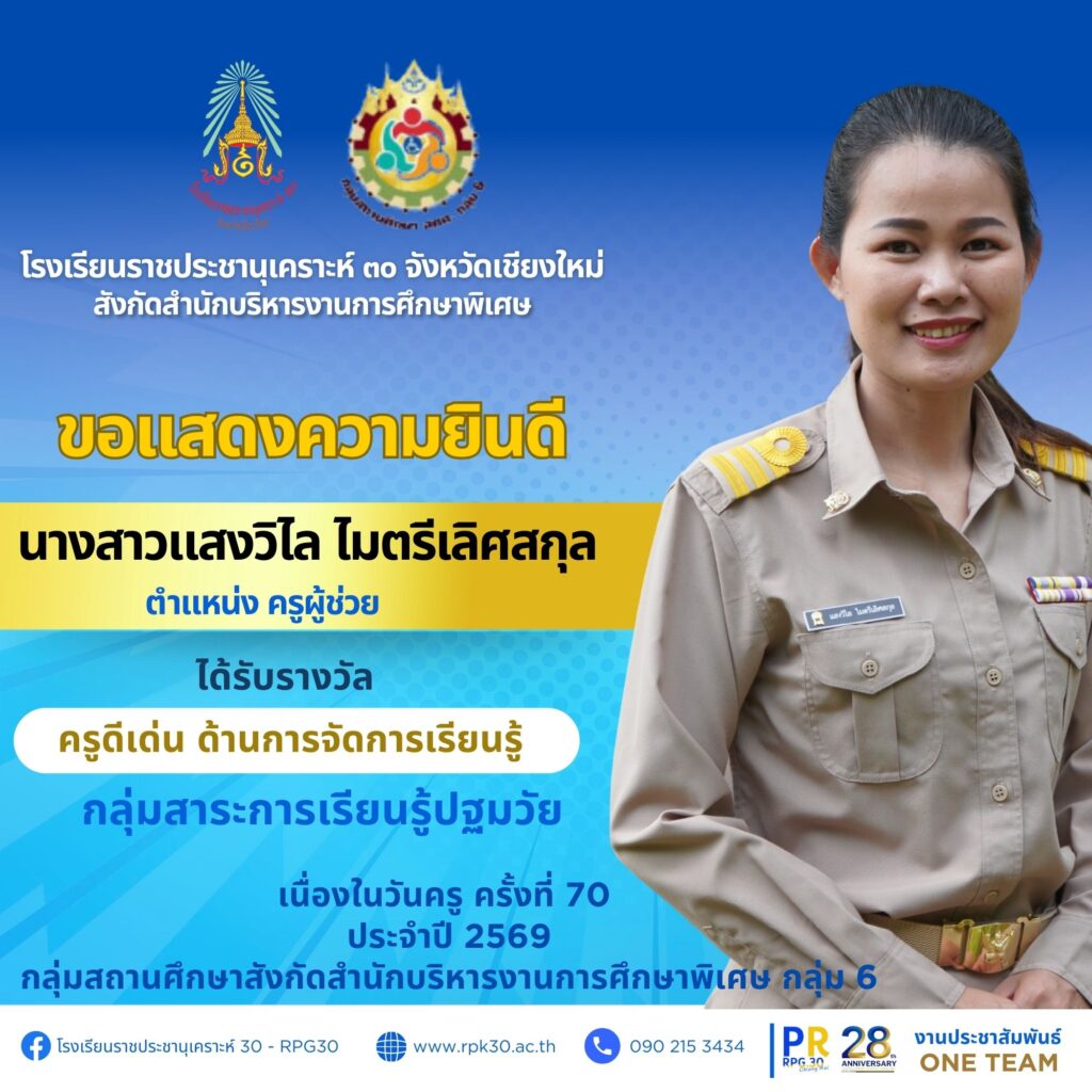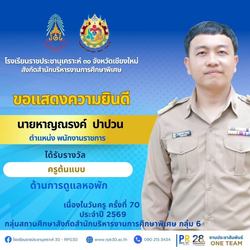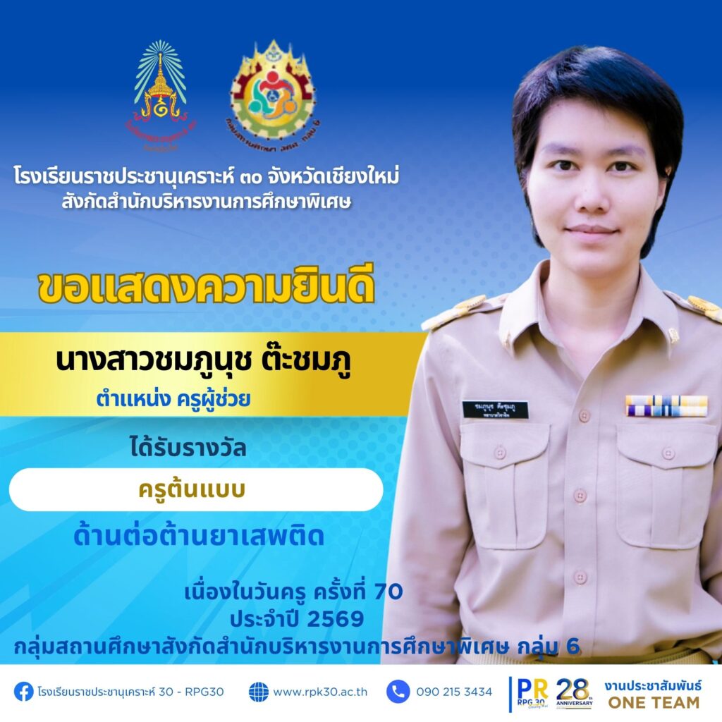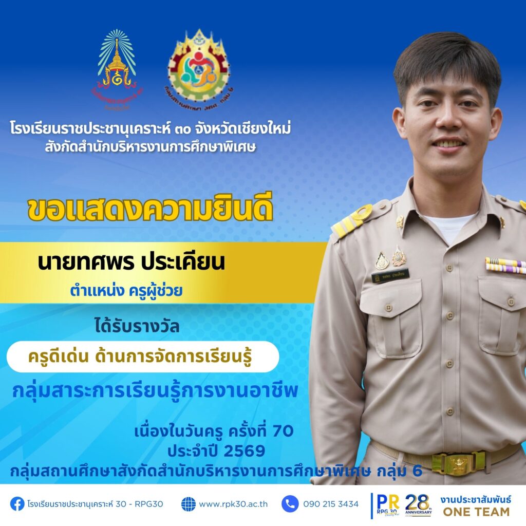 ข้าราชการครูและบุคลากรทางการศึกษา ที่ได้รับรางวัล ครูผู้สอนดีเด่น และรางวัลครูต้นแบบ เนื่องในวันครู ครั้งที่ 70 ประจำปี 2569 จากสำนักบริหารงานการศึกษาพิเศษ กลุ่ม 6 จำนวน 24 ราย ดังนี้