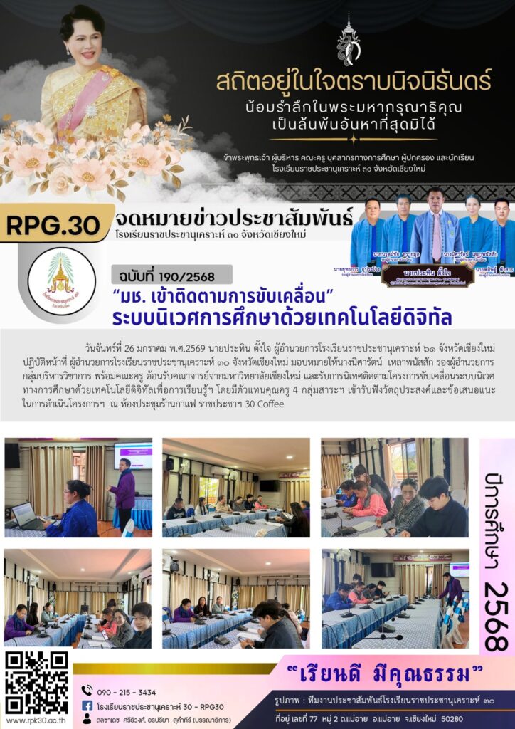 >>>วันจันทร์ที่ 26 มกราคม พ.ศ.2569 นายประทิน ตั้งใจ ผู้อำนวยการโรงเรียนราชประชานุเคราะห์ ๖๑ จังหวัดเชียงใหม่ ปฏิบัติหน้าที่ ผู้อำนวยการโรงเรียนราชประชานุเคราะห์ ๓๐ จังหวัดเชียงใหม่ มอบหมายให้นางนิศารัตน์ เหลาพนัสสัก รองผู้อำนวยการกลุ่มบริหารวิชาการ พร้อมคณะครู ต้อนรับคณาจารย์จากมหาวิทยาลัยเชียงใหม่ และรับการนิเทศติดตามโครงการขับเคลื่อนระบบนิเวศทางการศึกษาด้วยเทคโนโลยีดิจิทัลเพื่อการเรียนรู้ฯ โดยมีตัวแทนคุณครู 4 กลุ่มสาระฯ เข้ารับฟังวัตถุประสงค์และข้อเสนอแนะในการดำเนินโครงการฯ ณ ห้องประชุมร้านกาแฟ ราชประชาฯ 30 Coffee