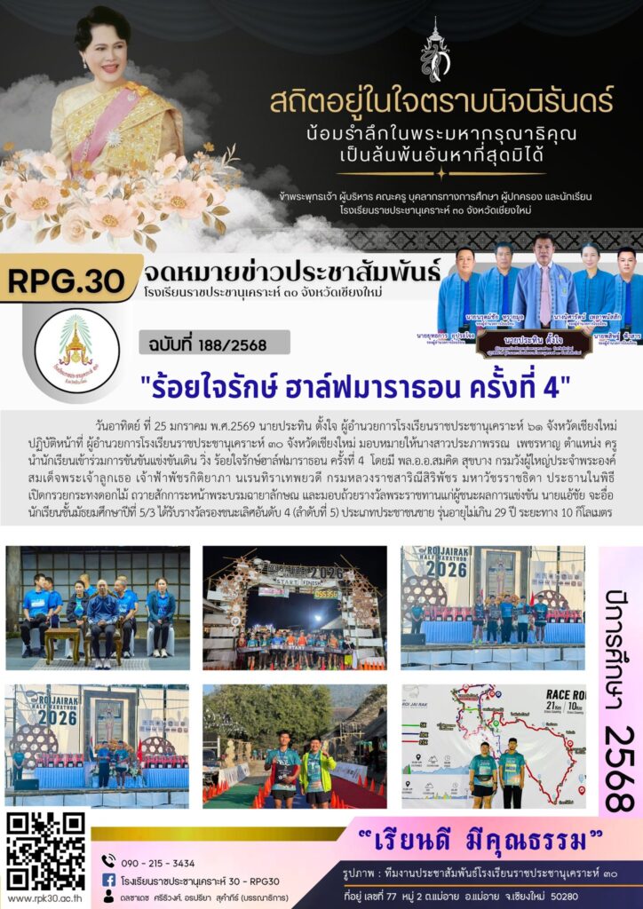>>>วันอาทิตย์ ที่ 25 มกราคม พ.ศ.2569 นายประทิน ตั้งใจ ผู้อำนวยการโรงเรียนราชประชานุเคราะห์ ๖๑ จังหวัดเชียงใหม่ ปฏิบัติหน้าที่ ผู้อำนวยการโรงเรียนราชประชานุเคราะห์ ๓๐ จังหวัดเชียงใหม่ มอบหมายให้นางสาวประภาพรรณ เพชรหาญ และว่าที่ร้อยตรีพุฒิพงษ์ วงศ์บุญมา ตำแหน่ง ครู นำนักเรียนเข้าร่วมการขันขันแข่งขันเดิน วิ่ง ร้อยใจรักษ์ฮาล์ฟมาราธอน ครั้งที่ 4 โดยมี พล.อ.อ.สมคิด สุขบาง กรมวังผู้ใหญ่ประจำพระองค์ สมเด็จพระเจ้าลูกเธอ เจ้าฟ้าพัชรกิติยาภา นเรนทิราเทพยวดี กรมหลวงราชสาริณีสิริพัชร มหาวัชรราชธิดา ประธานในพิธี เปิดกรวยกระทงดอกไม้ ถวายสักการะหน้าพระบรมฉายาลักษณ และมอบถ้วยรางวัลพระราชทานแก่ผู้ชนะผลการแข่งขัน นายแอ้ชัย จะอื่อ นักเรียนชั้นมัธยมศึกษาปีที่ 5/3 ได้รับรางวัลรองชนะเลิศอันดับ 4 (ลำดับที่ 5) ประเภทประชาชนชาย รุ่นอายุไม่เกิน 29 ปี ระยะทาง 10 กิโลเมตร
