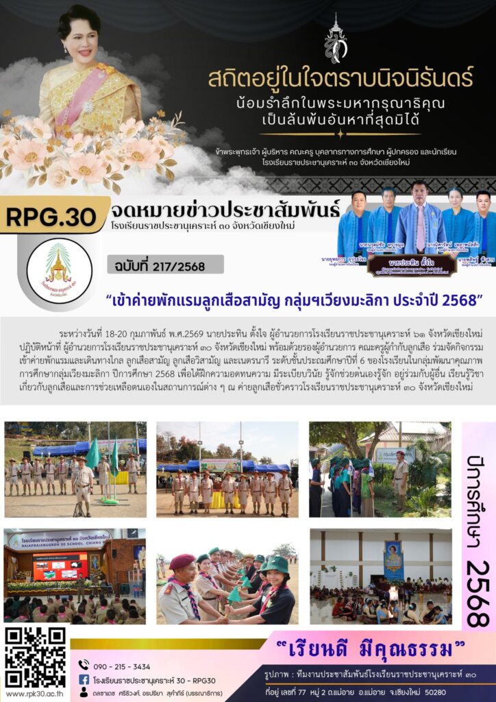 >>>ระหว่างวันที่ 18-20 กุมภาพันธ์ พ.ศ.2569 นายประทิน ตั้งใจ ผู้อำนวยการโรงเรียนราชประชานุเคราะห์ ๖๑ จังหวัดเชียงใหม่ ปฏิบัติหน้าที่ ผู้อำนวยการโรงเรียนราชประชานุเคราะห์ ๓๐ จังหวัดเชียงใหม่ พร้อมด้วยรองผู้อำนวยการ คณะครูผู้กำกับลูกเสือ ร่วมจัดกิจกรรมเข้าค่ายพักแรมและเดินทางไกล ลูกเสือสามัญ ลูกเสือวิสามัญ และเนตรนารี ระดับชั้นประถมศึกษาปีที่ ุ6 ของโรงเรียนในกลุ่มพัฒนาคุณภาพการศึกษากลุ่มเวียงมะลิกา ปีการศึกษา 2568 เพื่อได้ฝึกความอดทนความ มีระเบียบวินัย รู้จักช่วยตนเองรู้จัก อยู่ร่วมกับผู้อื่น เรียนรู้วิชาเกี่ยวกับลูกเสือและการช่วยเหลือตนเองในสถานการณ์ต่าง ๆ ณ ค่ายลูกเสือชั่วคราวโรงเรียนราชประชานุเคราะห์ ๓๐ จังหวัดเชียงใหม่