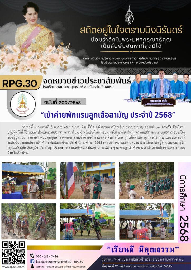 >>>วันพุธที่ 4 กุมภาพันธ์ พ.ศ.2569 นายประทิน ตั้งใจ ผู้อำนวยการโรงเรียนราชประชานุเคราะห์ ๖๑ จังหวัดเชียงใหม่ ปฏิบัติหน้าที่ ผู้อำนวยการโรงเรียนราชประชานุเคราะห์ ๓๐ จังหวัดเชียงใหม่ มอบหมายให้ นางนิศารัตน์ เหลาพนัสสัก และนายยุทธการ อุประโจงรองผู้อำนวยการค่ายฯ ควบคุมดูแลการจัดกิจกรรมเข้าค่ายพักแรมและเดินทางไกล ลูกเสือสามัญ ลูกเสือวิสามัญ และเนตรนารี ระดับชั้นประถมศึกษาปีที่ 4 ถึง ชั้นมัธยมศึกษาปีที่ 6 ปีการศึกษา 2568 เพื่อได้ฝึกความอดทนความ มีระเบียบวินัย รู้จักช่วยตนเองรู้จักอยู่ร่วมกับผู้อื่น เรียนรู้วิชาเกี่ยวกับลูกเสือและการช่วยเหลือตนเองในสถานการณ์ต่าง ๆ ณ ค่ายลูกเสือชั่วคราวโรงเรียนราชประชานุเคราะห์ ๓๐จังหวัดเชียงใหม่