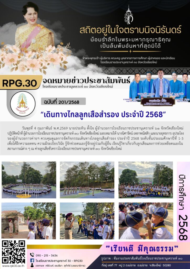 >>> วันพุธที่ 4 กุมภาพันธ์ พ.ศ.2569 นายประทิน ตั้งใจ ผู้อำนวยการโรงเรียนราชประชานุเคราะห์ ๖๑ จังหวัดเชียงใหม่ ปฏิบัติหน้าที่ ผู้อำนวยการโรงเรียนราชประชานุเคราะห์ ๓๐ จังหวัดเชียงใหม่ มอบหมายให้ นางนิศารัตน์ เหลาพนัสสัก และนายยุทธการ อุประโจงรองผู้อำนวยการค่ายฯ ควบคุมดูแลการจัดกิจกรรมเดินทางไกลลูกเสือสำรอง ประจำปี 2568 ระดับชั้นประถมศึกษาปีที่ 1-3เพื่อได้ฝึกความอดทน ความมีระเบียบวินัย รู้จักช่วยตนเองรู้จักอยู่ร่วมกับผู้อื่น เรียนรู้วิชาเกี่ยวกับลูกเสือและการช่วยเหลือตนเองในสถานการณ์ต่าง ๆ ณ ค่ายลูกเสือชั่วคราวโรงเรียนราชประชานุเคราะห์ ๓๐ จังหวัดเชียงใหม่