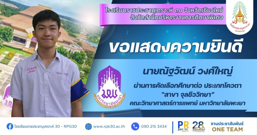 “ขอแสดงความยินดีกับ”นายณัฐวัฒน์ วงศ์ใหญ่ 25 กุมภาพันธ์ 256925 กุมภาพันธ์ 2026 nakio.th1234@gmail.com ข่าวประชาสัมพันธ์, ผลงานนักเรียน/ครูผ่านการคัดเลือกศึกษาต่อ ประเภทโควตา “สาขา จุลชีววิทยา”คณะวิทยาศาสตร์การแพทย์ มหาวิทยาลัยพะเยาFacebookFacebookXXLINELine